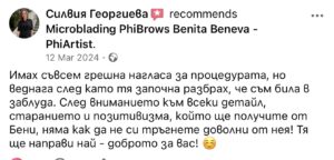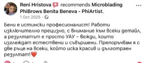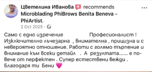 Професионална квалификация и международен опит в сферата на микроблейдинга и миглопластиката. Прилагане на прецизни техники за оформяне, базирани на световните стандарти на Phi Academy.