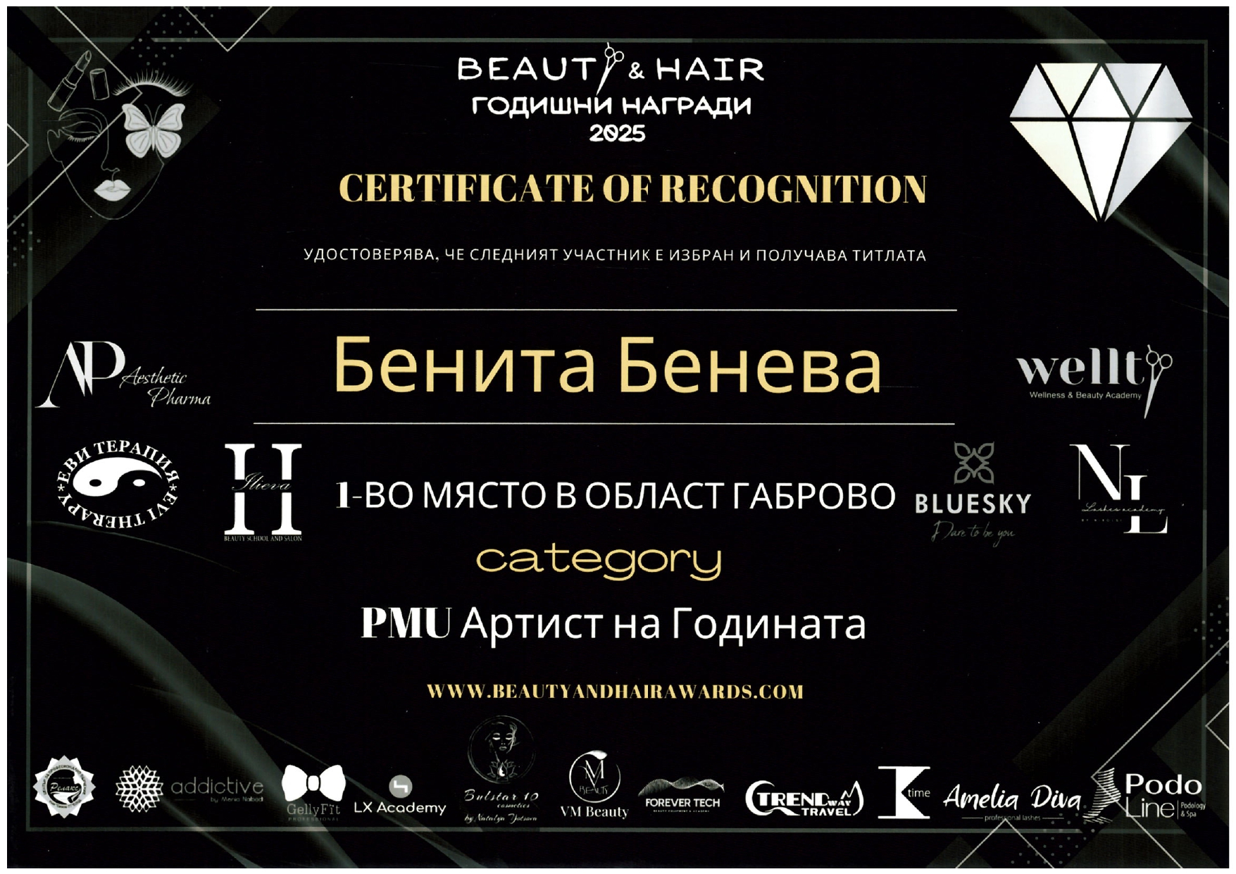Като носител на 1-во място за PMU артист в областта и 6-то място в България, аз гарантирам работа по най-високите критерии за хигиена и естетика. Моят стремеж е винаги да бъда сред най-добрите в индустрията.